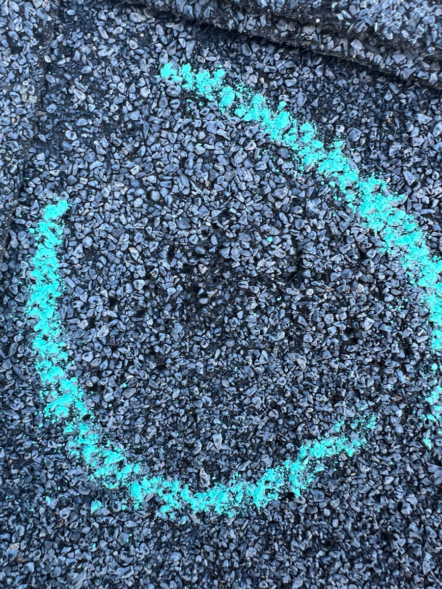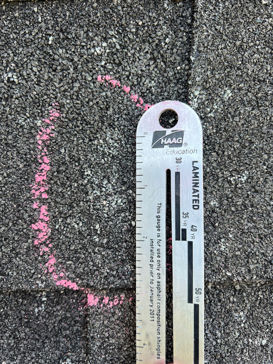 A close-up of a single hail hit circled in chalk — notice how the granules have been displaced, exposing the dark asphalt mat beneath.
