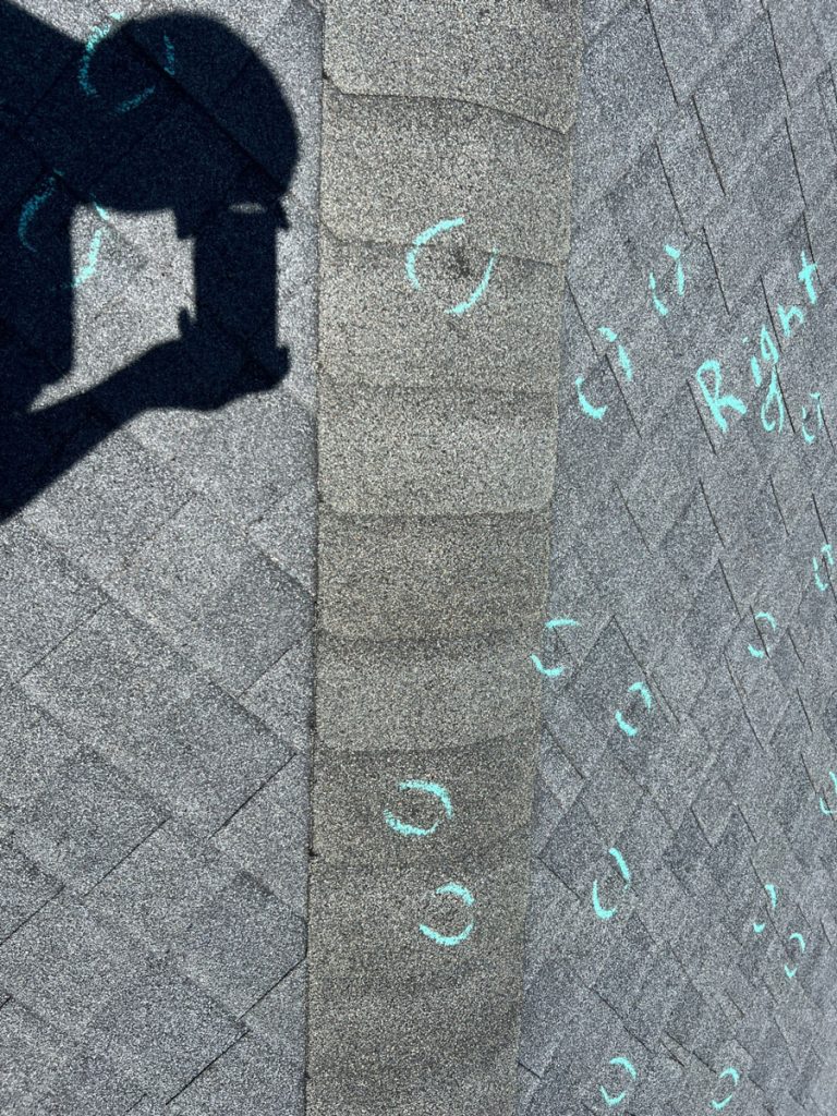 The first clue is often the easiest to spot — if the hail event was recent. Over time, a blue-green algae grows on the north-facing slopes of most shingled roofs. When a hailstone hits, it scrubs that algae clean, leaving behind a round, lighter-colored mark we call a spatter mark.