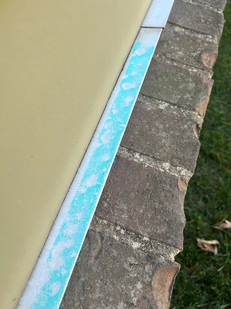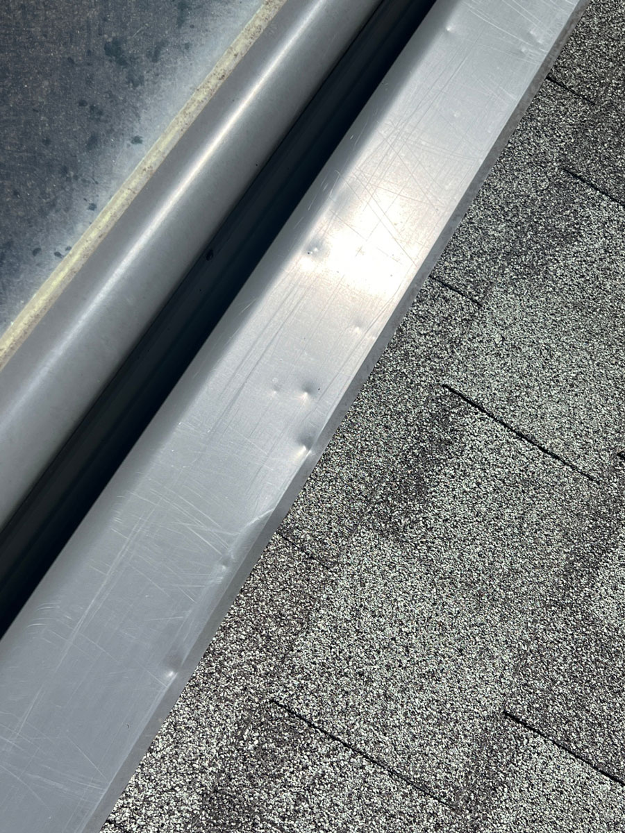 Hail dents on painted metal flashing — collateral evidence like this on non-shingle surfaces strengthens a damage claim.