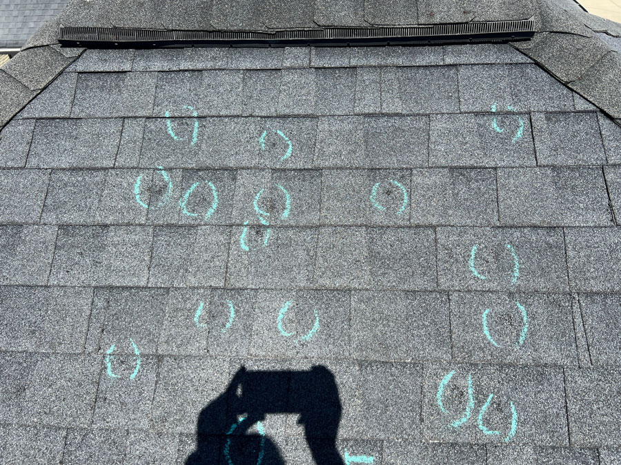 Chalk circles mark individual hail hits on ridge cap shingles — these unsupported shingles are the most vulnerable part of the roof.