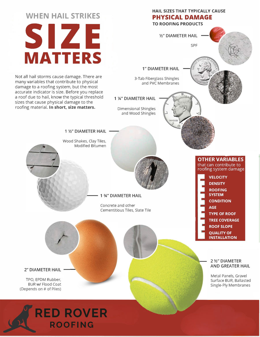 Hail size matters — this infographic shows common hail diameters compared to everyday objects and the damage thresholds for different roofing materials.